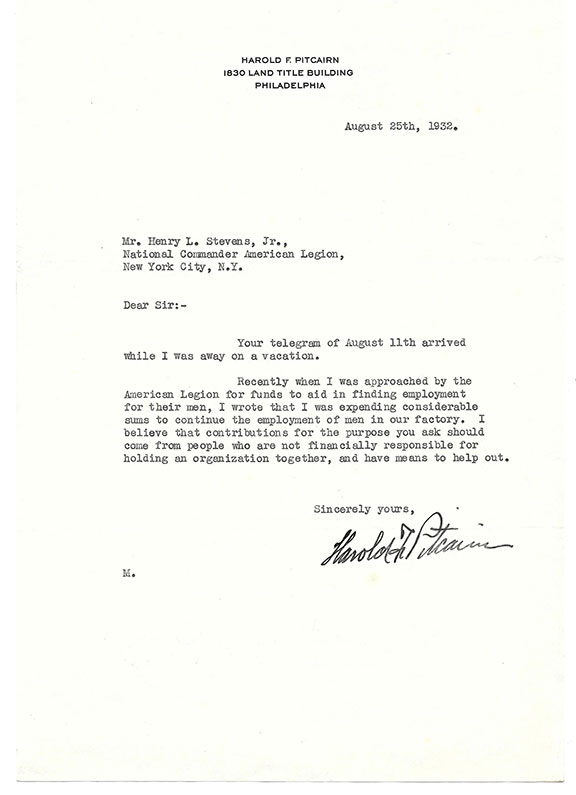 PITCAIRN, Harold F. (1897-1960). American aviation inventor and pioneer. He founded the Autogyro Company of America. Founded Pitcairn Aviation which later became Eastern Airlines. He also founded Pitcairn Aircraft Company which manufactured Air Mail planes and autogyros. In 1931, one of his pilots landed an autogyro on The White House lawn as President Hoover was awarding Pitcairn the Collier Trophy. On April 24, 1960 at the age of 62, Pitcairn committed suicide in his home in Philadelphia. Very uncommon typed letter signed, one page on his name imprinted letterhead. August 25, 1932 to Henry L. Stevens, National Commander of the American Legion. Pitcairn writes in part: “…Recently when I was approached by the American Legion for funds to aid in finding employment for their men, I wrote that I was expending considerable sums to continue the employment of men in our factory. I believe that contributions for the purpose you ask should come from people who are not financially responsible for holding an organization together, and have means to help out.” Signed with a fantastic bold signature. Anything signed by Pitcairn can be considered rather scarce. Excellent condition..............SOLD