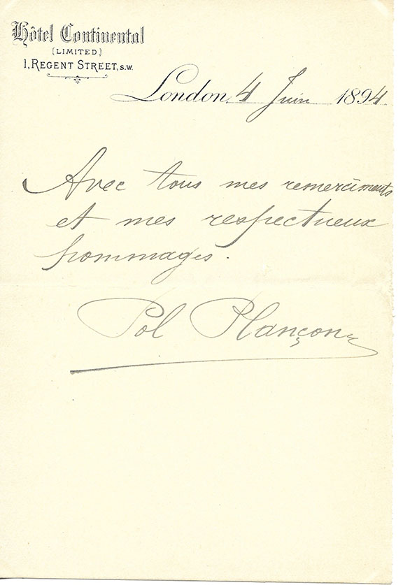 PLANCON, Pol (1851-1914) French bass, one of the most acclaimed basses of the Golden Age of Opera. Short A.L.S. on the Hotel Continental, Regent Street letterhead. London, 4 June 1894. Short 3-line friendly note signed with a full signature. In very good condition.................................$145.00