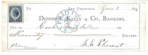 In 1868, she brought a lawsuit against two San Francisco trolley lines whose conductors had refused to allow her to ride. Her suit went to the California Supreme Court where she won the rights for all African Americans to ride the streetcars. During her lifetime, she amassed a $30 million fortune. She was also known as the “Queen of Voodoo.” She built the “House of Mystery” on Octavio Street in San Francisco. Very RARE partly printed check, signed: “M.E. Pleasant.” Measures 7.75”x3”, San Francisco, California, June 3, 1876. Made out to “Cash” for $20.00. Drawn on Donohoe, Kelly & Co. Bankers. A rarely encountered autograph in any form. Very fine condition...............SOLD