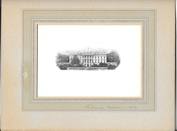 NIXON, Patricia (1912-1993). First Lady. Engraving of The White House, attractively matted. Signed with a full signature of Patricia Nixon and dated in her hand “1971”, as First Lady. Most unusual...................................SOLD![]() |