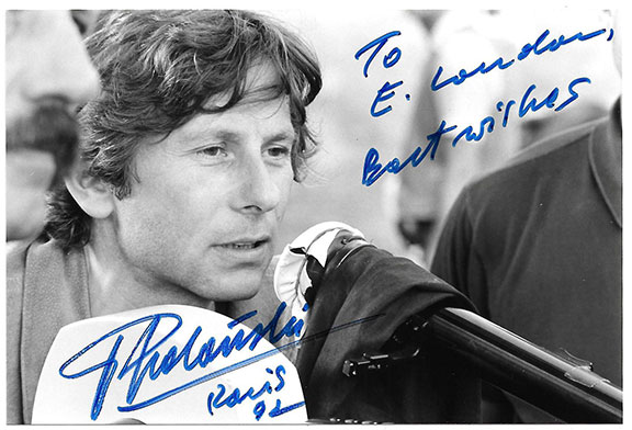POLANSKI, Roman (1933- ) French/polish film director. In 1969 his pregnant wife Sharon Tate was murdered by the Manson Family. In 1977 Polanski was arrested for the rape of a 13 year old girl. He fled to Paris before sentencing. He is the winner of many awards including the Academy Award for Best Director for The Pianist. Uncommon photograph, appx. 4"x5", B&W, head and shoulders pose appears to be directing a film. Inscribed, signed and dated: "To E. London, Best Wishes, R. Polanski, Paris 92." In excellent condition.................... $125.00