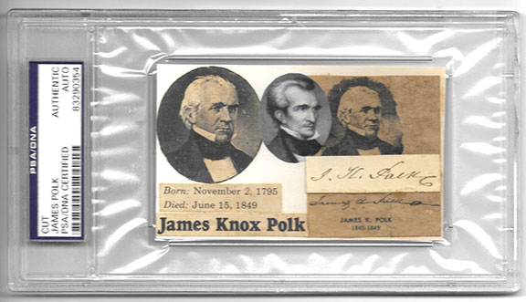 POLK, James K. (1795-1849). Served in Congress and later as the 7th Governor of Tennessee. President of the United States (1845-1849). Slave owner most of his adult life. First President elected despite losing his own state. As President, he settled with England a boundary between Oregon and Canada. The first official US stamps were issued under his tenure as President in 1847. Choice signature “J. K. Polk” encapsulated in a PSA/DNA authenticated plastic coffin along with additional trivia. Signature is choice.................$1400.00
