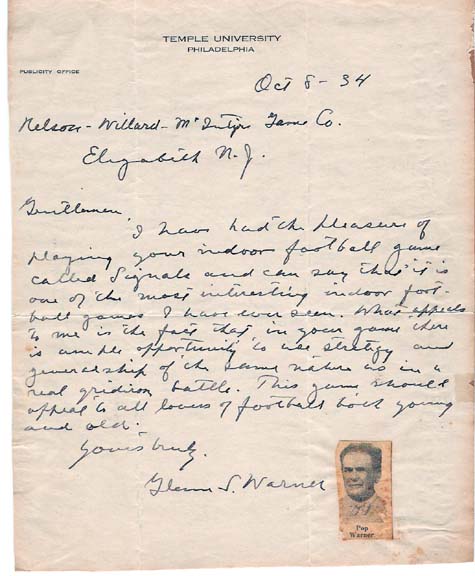 - WARNER, Glenn S. 'Pop' (1871-1954). Legendary Football Coach who developed the single