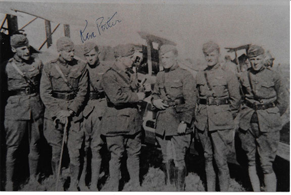 PORTER, Kenneth. American pilot during WW1. Ace, credited with 6 victories. Photograph, 4”X6” of Porter with several other pilots standing in front of their bi-plane. Porter has signed directly above his head. Fine condition....$95.00![]() |