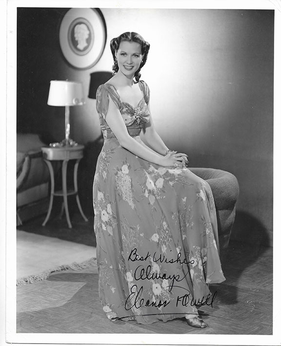 POWELL, Eleanor (1912-1982) American actress and dancer. MGM’S top dancing star during the Golden Age of Hollywood. In 1965, she was named the World’s Greatest Tap Dancer. She is considered the only female dancer to out dance Fred Astaire. Striking 8”x10” B&W photograph by MGM photographer Clarence S. Bull. Powell is wearing a full length gay floral printed evening gown and having a very pretty smile. Stated on verso she will soon be seen in The Ziegfield Girl circa 1940-41. Boldly signed with a three-word sentiment: “Best Wishes Always, Eleanor Powell.” In V/G to Fine condition.....................$225.00