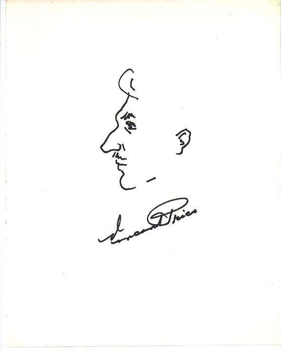 PRICE, Vincent (1911-1993).  U.S. character actor and horror star. Best remembered for his roles in The Raven and House of Wax.  Original self portrait sketch of his profile, signed on a sheet measuring 8”x10”. A very attractive and larger than usual portrait