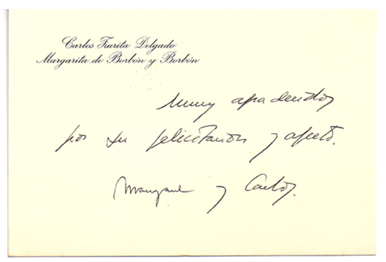HER ROYAL HIGHNESS PRINCESS MARGARITA MARIA DE LA VICTORIA DE BOURBON Y BOURBON OF SPAIN. (1937-    ) Younger sister of King  Juan Carlos I of Spain. She was born in Rome and has been blind since birth. Her title is Her Royal Highness, The Duchess of Soria and Hernani. DR. DON CARLOS ZURITA Y DELGADO (1943-   ). Husband of Princess Margarita. Their name engraved correspondence card where there is   a several word sentiment, signed by both...............................$35.00
