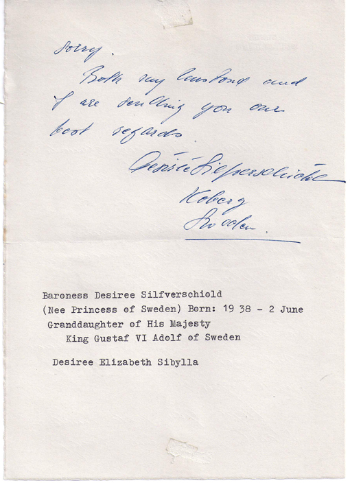 HER ROYAL HIGHNESS PRINCESS DESIREE ELIZABETH SIBYLLA OF SWEDEN (1938- ). Third child of Prince Gustaf Adolf and princess Sibylla. Granddaughter of Gustaf VI of Sweden. Her brother is King Carl Gustaf of Sweden. As a result of her non Royal marriage in 1964, she lost the title of Royal Highness and was named Princess Desiree, Baroness Silfverschiold. Autograph letter signed, one and a half pages, Koberg, Sollebrunn, 7th of Sept. 1971. Princess Desiree writes in part: “…your nice letter and kind congratulations for our wedding anniversary. You also kindly asked us for photos of ourselves but I’m afraid I have to disappoint you! Hope you will understand, I am really sorry. Both my husband and I are sending you our good regards…” Signed “Desiree Silfverschiold, Koberg, Sweden”............$65.00
