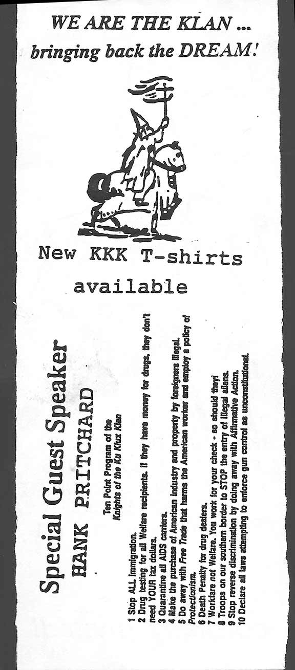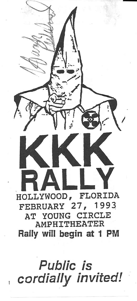 PRITCHARD, Hank Grand Wizard of the Ku Klux Klan, KKK Organizer, unemployed postal worker active in Klan activities in South Florida. He has been disowned by a National Klan. The Knight’s of the Ku Klux Klan have pulled Pritchard’s membership. KKK Rally Notice that was to be held in Hollywood, Florida on Feb. 27, 1993. Both Pritchard and Marilyn Manson was attending an art exhibition of John Wayne Gacy. Pritchard was handing out these notices. In person signature.......................$25.00