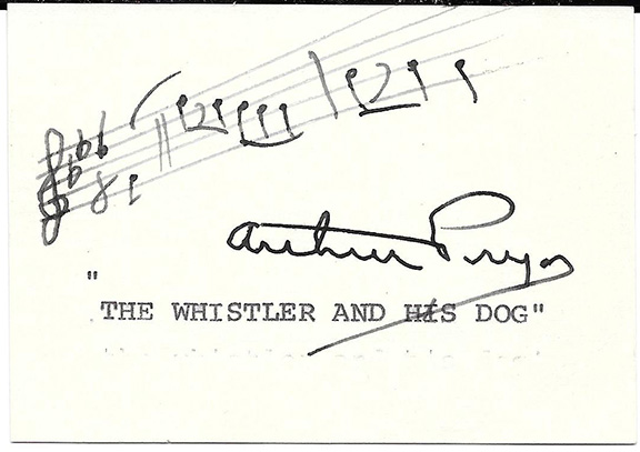 PRYOR, Arthur (1870-1942). Bandmaster, composer, trombone soloist and featured star in the Sousa Band. He played over 10,000 solos during his twelve years with the Sousa Band. His name was a household word for over three decades. He was a major influence in American musical life. He wrote three complete operas. His “Razazza Mazzazza” is called the “King of Rags”. He may be best remembered for his big hit “Whistler And His Dog”. On a card, Pryor has written three bars of music from his hit “Whistler And His Dog”. Boldly signed and very uncommon..................................SOLD