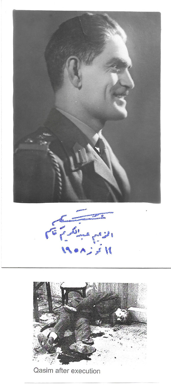QASIM, Abd Al-Karim (1914-1963). Army Brigadier of Iraq, twenty-fourth Prime Minister, Minister of Defense. He came to power when the Iraq Monarchy was overthrown during the 14 July Revolution. Qasim deposed King Faisal II and assassinated hIm and his family. He was known as “The Leader.” At one time early in his career he was nicknamed “The Snake Charmer.” He served in the Arab Israeli War from May 1948 thru June 1949. There was an assassination attempt on October 7, 1959 and Saddam Hussein, who was part of the group, fired shots into Qasim’s car hitting him twice, once in the arm, the other in his shoulder however he survived. The chauffer was killed. Some of the would be-assassins were captured, tried, and were executed.