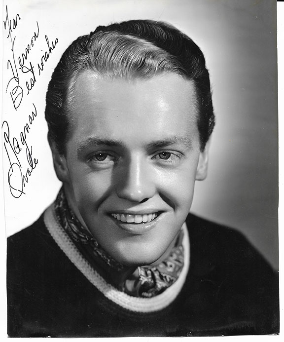 QUALE, Ragnar (1915-2001). Actor and architect. Designed the original Sarah Hotel in Las Vegas. Quale restored the former house of Mary Pickford. He taught skiing to Darryl F. Zanuck in 1939. Quale signed a contract with 20th Century Fox. He was a pilot during WWII. He played a Nazi Officer in the 1940 drama Four Sons and performed stunts for Milton Berle in Sun Valley Serenade. Wonderful uncommon vintage 20th Century Fox borderless photograph, 7”x9”, head and shoulders pose, full face and smiling. Inscribed and signed using a fountain pen: “For Vernon Best Wishes Ragman Quale. Signed photos of Quale are rather scarce. Light rippling along some of the edges otherwise in very good condition.........$85.00