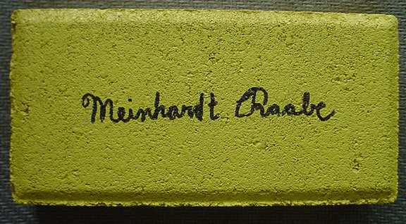 Yellow Brick, measures appx: 4”x8”x1.75” which has been hand signed by Meinhardt Rabbe. Twenty-five bricks were signed by Rabbe in the Office of Stephen Koschal the night before Raabe was to be the autograph guest at the autograph convention in Ft. Lauderdale. The autograph convention/sale was created and promoted by Stephen Koschal. Raabe’s signature is fine and bold. Brick weights about four pounds. A fabulous item for a Wizard of Oz collection or a gift to a grand child..................$45.00