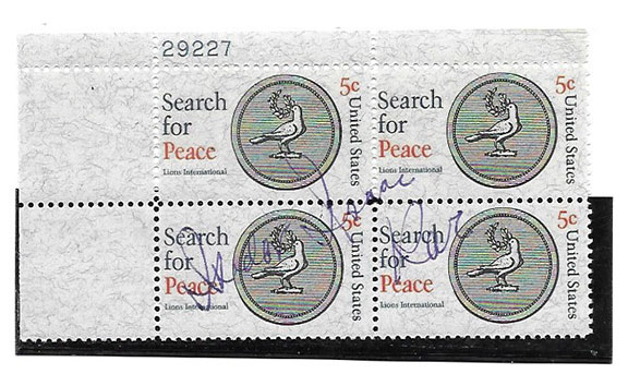 RABI, Isidor Isaac (1898-1988). U.S. Physicist who worked on the development of radar and the A-Bomb. He was awarded the Nobel Prize Physics (1944). He was the first scientist in the U.S. to work on cavity magnetron which is used in microwave ovens. Plate block of four U.S. 5 cent Search For Peace stamps. Signed in full across the stamps....................................$45.00![]() |