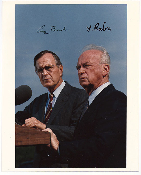Splendid Official color White House photograph of both Rabin and Bush, head and shoulders pose, both looking quite serious. Boldly signed by both Rabin and Bush in the light blue area of the sky offering excellent contrast. The finest example possible ..................................$595.00
