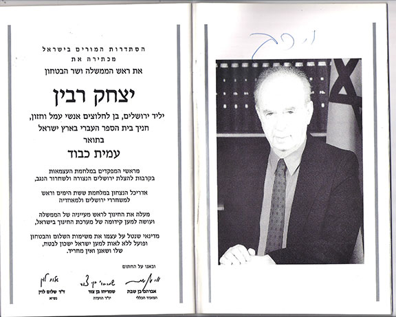 RABIN, Yithzak (1922-1995). Prime Minister (1974-1977), (1992-1995). Military leader and a brigade commander during the War of Independence (1948). Chief of Staff during the Six-Day War. He forged the peace treaty known as the Oslo II agreement between the PLO for which he won the Nobel Peace Prize along with Shimon Peres and Yassir Arafat. Rabin was assassinated by an Israeli extremist on November 4, 1995 after attending a peace rally. Rare booklet “Teacher’s Day Booklet” 1994, 32 pages signed by Knesset Speaker Shevah Weiss on the inside cover. Weiss was also a survivor of the holocaust and the Israeli Ambassador to Poland. Inside on page 4, is a full page portrait of Yithzak Rabin. Rabin has signed his name in Hebrew above his portrait. In fine condition...........$250.00