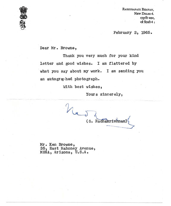 RADHAKRISHNAN, S. (1888-1975). Indian philosopher and statesman who became the first vice-president of India ((1952-1962). Second President of India (1962-1967). He was influential in shaping the understanding of Hinduism in both India and the west. Winner of many awards including knighthood in 1931. Typed letter signed, one page as President of India, February 2, 1965. He writes in part: “...I am flattered by what you say about my work...” Choice blue ink signature.............................................$175.00