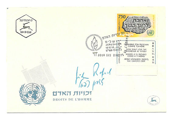 RAFAEL, Gideon (1913-1999). Israelis’ Ambassador o the U.N. Founder of Israeli’s Foreign Ministry. Served in the U.N. and Europe conducting secret contacts with Arab Countries. In 1940 he was sent to Europe to negotiate the rescue of 40,000 German Jews. His assignment was to send out the pronouncement of the Birth of Israel. He found a British man who would make the payment for the telegrams. Rafael approved the expense and Israel’s Birth was announced to the world. Very scarce United Nation’s FDC with a double signature of Rafael both in English and Hebrew. A very scarce signature. In fine condition...........................SOLD