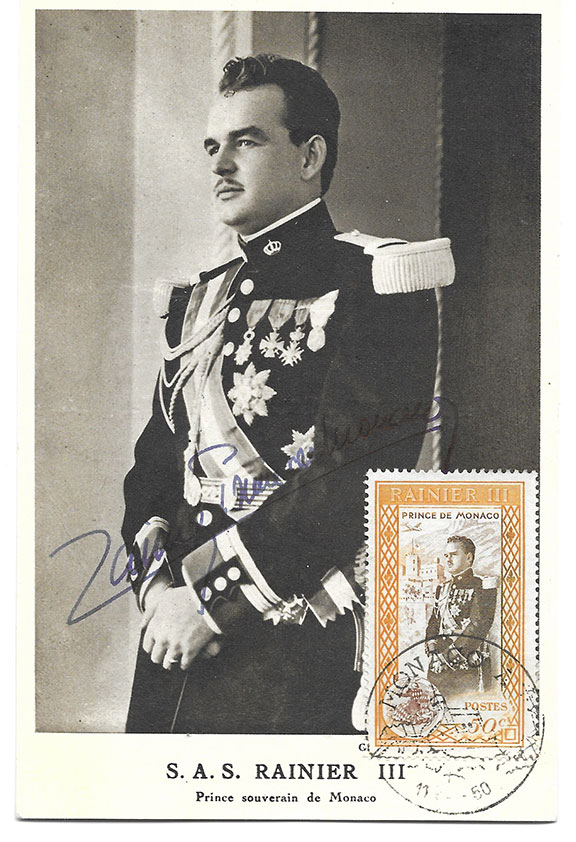 RAINIER III, S.A.S (1923-2005) Prince of Monaco (1949-2005) at the age of 25. Ruled Monaco for 56 years. Rare, early postcard photograph just months after becoming sovereign prince of Monaco. Wonderful Monaco postage stamp of Prince Rainier postmarked Monaco (11-?-50) boldly signed Rainier Pince of Monaco. In very fine condition.......................$225.00 |