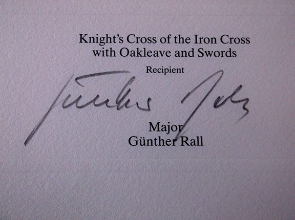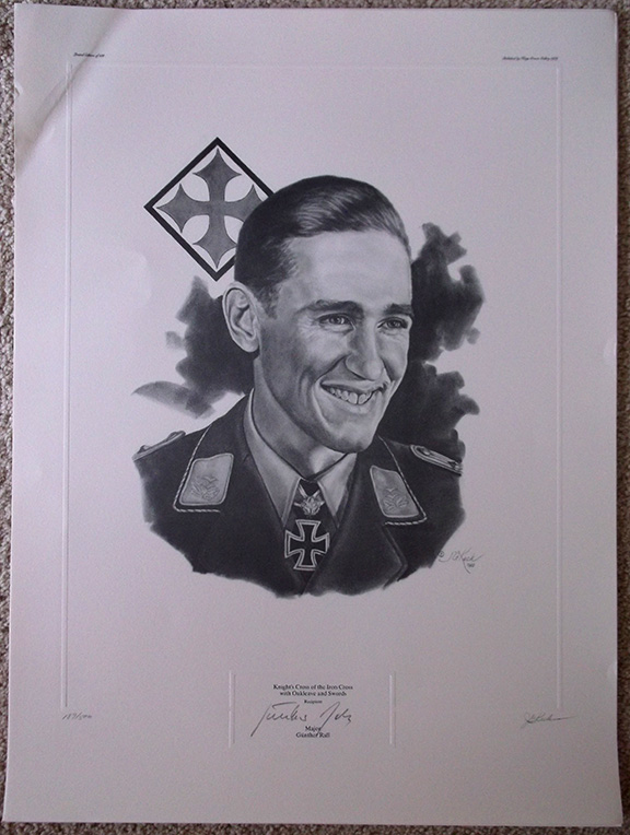 RALL, Gunther (1918-2009). German fighter pilot and third most successful Ace in the history of aerial warfare, credited with 275 victories. Rall earned the Knight’s Cross of the Iron Cross with Oak Leaves and Swords. He was shot down eight times and wounded three times. Rall was held as a prisoner of war in a Heidelberg camp. Wonderful lithograph by artist Janet Keck, published by King’s Crown Gallery in 1989. Limited to 500 numbered copies and hand signed by both Keck and Rall. Rall is head and shoulders pose in uniform wearing his Knight’s Cross. Measures appx: 19”x25”. Light crease at top left corner, most of which can be matted out. After the printing of these lithographs, the printing plates were destroyed. At this time we have four of these lithographs. Each......$135.00