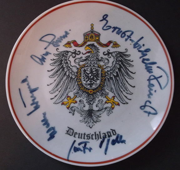 Porcelain plate depicting the German Imperial Eagle. Hand signed by all four with “in person” signatures. All obtained at a Luftwaffe Reunion in Germany. In excellent condition. One of a kind!................................SOLD