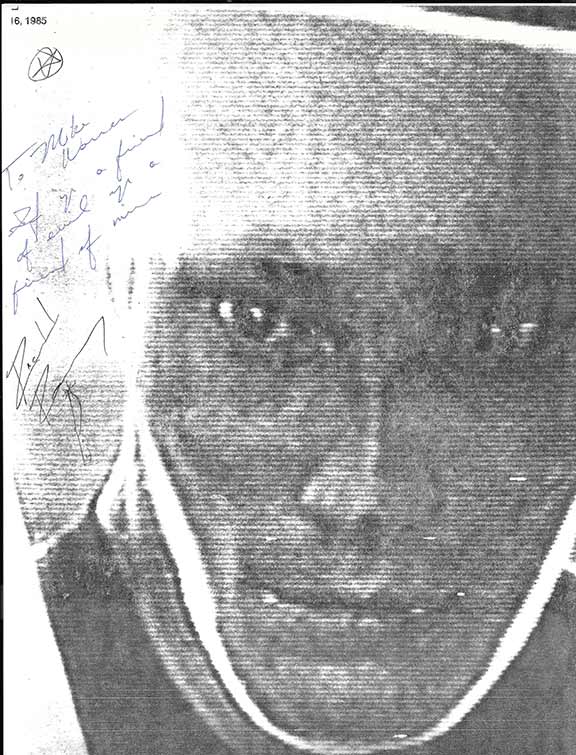 RAMIREZ, Richard (1960- 2013). In the summer of 1985 the front pages of the L.A. newspapers dubbed the new serial killer “The Night Stalker”. A sadistic home invader with a taste for savage mutilation. He was convicted of killing 14 persons. He carved out the eyes of one of his female victims. He is known for drawing satanic pentagrams on some of the bodies and walls of their homes. Unusual photocopy of a close-up of the face of Ramirez taken in 1985. He has inscribed this portrait in the light area in blue ink: “To Mike Warrren, if you’re a friend of evil you’re a friend of mine”. He then signs his name in black ink and draws a switch blade knife. He also draws a star with a circle around it. A very unusual piece with an evil inscription. In fine condition................SOLD