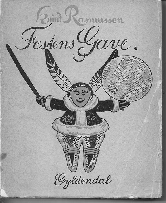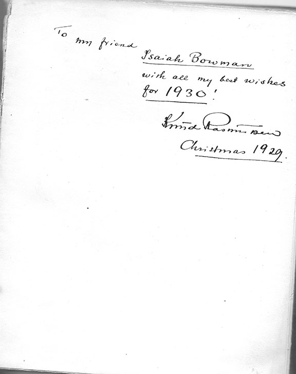 RASMUSSEN, Knud (1879-1933) Danish polar explorer. Called “The Father of Eskimology.” He was the first European to cross the Northwest passage on dog sled. He established the most northerly trading post in the world. Rasmussen was awarded many awards. He book in Danish: “Festens Gave” Eskimoiske Alaska, Adventure, Gyldendalske, Kbenhavn, 1929, First Edition. Two hundred five pages with all maps intact. Heavily illustrated in color. Hard paper covers. Choice presentation inscription: “To my friend Isaiah Bowman with all my best wishes for 1930, Knud Rasmussen Christmas 1929.” Isaiah Bowman (1878-1950) was an explorer, American geographer, educator, Director of the American Geographic society, President of Johns Hopkins and a leader in the South America Expeditions. Book is intact, tight with front cover partially loose. The spine is intact. Edge of front cover a bit brittle. Otherwise a nice copy............$395.00