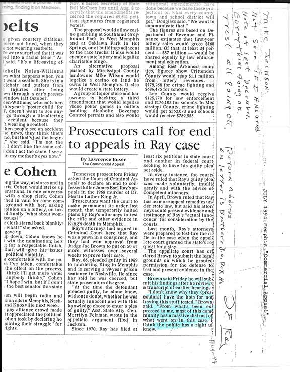 RAY, James Earl (1929-1998). Convicted assassin of civil rights leader martin Luther King, Jr. (1968). Ray pleaded guilty to the murder in Memphis and was given a 99 year prison sentence. Ray died in a Tennessee prison in 1998. Copy of a July 1994 newspaper article from the “Memphis Commercial Appeal” titled “prosecutors call for end to appeals in Ray case”. Inscribed, in ink on the side margin: “Mike Jackson, not sure if I answered note of last December, Everything going OK. Trust all going OK. Return address on letter is Brother’s P.O. Box No., J.E. Ray, Aug.-94”. Most unusual in this form regarding his legal matters..........................$175.00