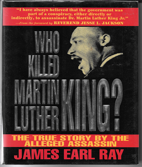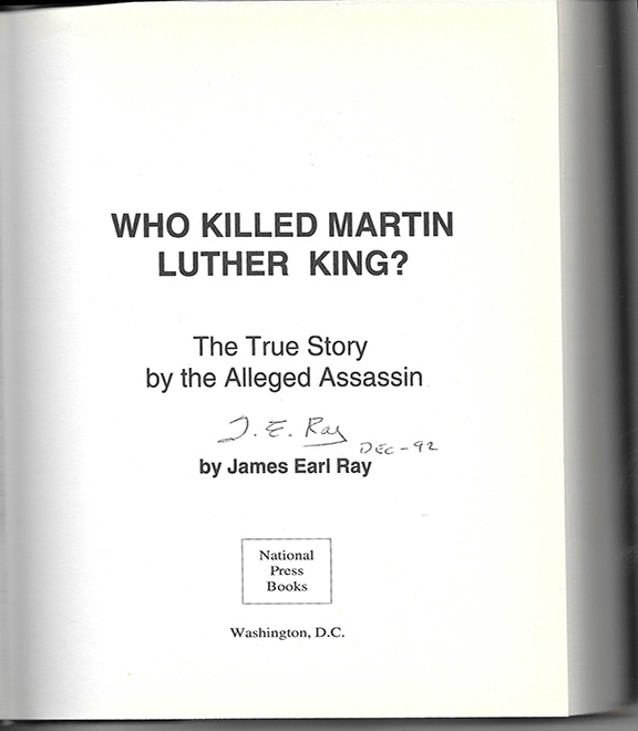 RAY, James Earl A copy of his book: "Who Killed Martin Luther King? The True Story By The Alleged Assassin". National Book press, Washington, D.C., 1992, First Edition. Two hundred eighty-five pages, illustrated, Signed "J.E. Ray, Dec.92" on the title page. Affixed to the front free endpaper is the postmark; "Nashville, Tn. 16, Dec. 1992" and the label from the envelope: "The Department of Corrections Has neither Censored Nor Inspected This Item: Therefore The Department Does Not Assume Responsibility For Its Contents. Department of Correction, Riverbend Maximum Security Inst." Book and dust jacket in excellent condition. Signed copies of this book are basically non-existent. ................$495.00