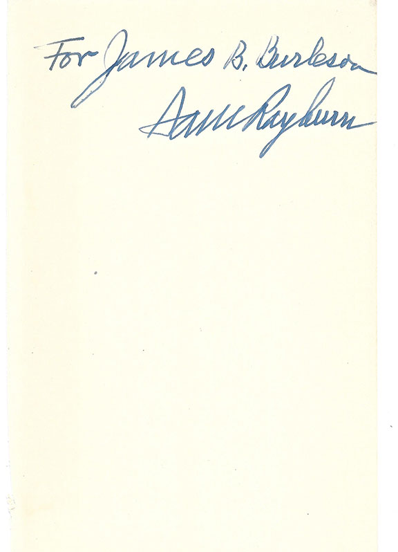 RAYBURN, Sam (1882-1961). Speaker of the House for 17 years. President of the United States for 25 minutes.  Choice inscription and full signature on a page removed from a book. As nice a signature as one can ever expect. Should you collect signatures of presidents of the United States, and example of Sam Rayburn is a must to complete your collection.....................
