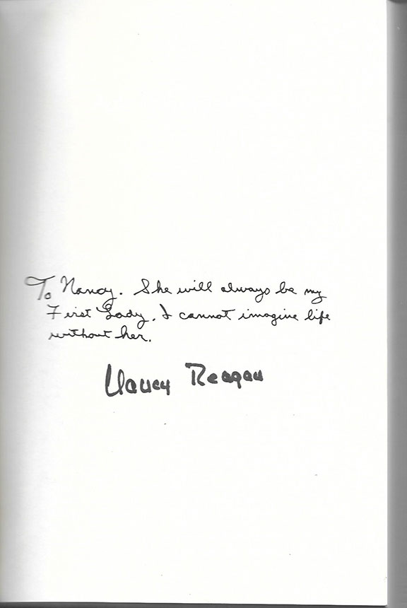 REAGAN, Nancy (1921-2016). American film actress. Second wife of Ronald Reagan, 40th President of the United States. Very popular First Lady. “An American Life, Autobiography of Ronald Reagan” Simon & Schuster, 1990. Signed by Nancy Reagan on the dedication page. In fine condition with the dust jacket. Most unusual to find Nancy Reagan signing this particular book........SOLD![]() ![]() |