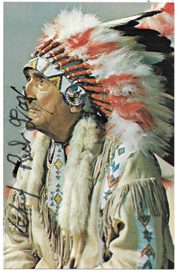 Chief Red Fox. (1870-1976). Sioux Indian Chief. His uncle Crazy Horse was killed by U.S. Army Soldiers after he defeated Custer’s Cavalry. In 1893, Buffalo Bill visited the pine Ridge Reservation to recruit Native Americans to perform in his Wild West Show. He asked Chief Red Fox to join him and appear at the Chicago Worlds Fair. Chief red Fox was a translator and worked with Buffalo Bill for many years. During 1905, Chief red Fox “scalped” King Edward VII during a stagecoach robbery scene in a Wild West Show performance in London. Chief Red Fox appeared in 14 early silent movies. Besides Buffalo Bill, Chief Red Fox was friends with Thomas Edison, Alexander graham Bell, Theodore Roosevelt, Jack London, Will Rogers and King Edward VII. Color postcard photograph, half length in full Indian dress. Very boldly signed in ink. Very fine condition and very desirable autographn................$185.00