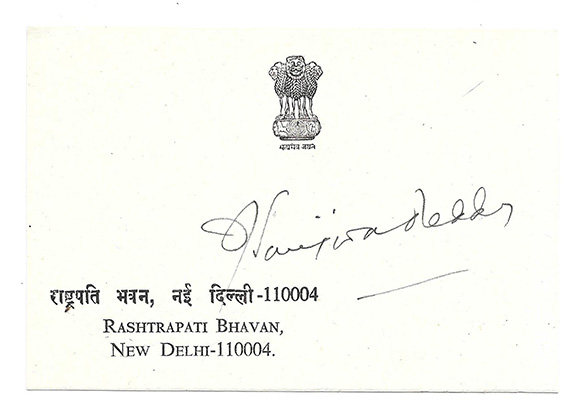 REDDY, N. SANJIVA  (1913-1996).  Sixth President of India (1977-1982). He became the youngest ever Indian president. He was closely associated to the Indian struggle for independence from the British. He was jailed from 1940-1945 serving time with activists.  His signature on his Official Presidential card.  Rashtrapati Bhavan is the Official Residence of the President of India. Not common in this form......................