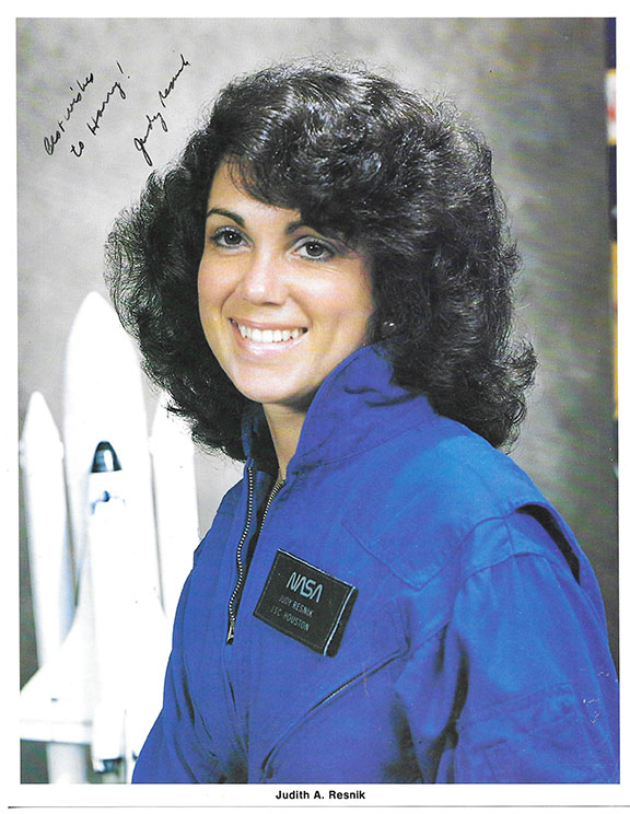 RESNICK, Judy (1949-1986). First Jewish American astronaut. She perished aboard the ill-fated Challenger mission along with six other astronauts. She was the "First Woman Astronaut Candidate to Participate in the T-38 Shuttle Simulation Flight" above White Sands. Attractive NASA Official Photograph of Resnick in her blue jacket with NASA patch posing in front of a model of the Shuttle. Short biography of Resnick printed on verso. Inscribed and signed using a black ink pen on a light portion of the photo offering excellent contrast. "Best wishes to Harry! Judy Resnick". In fine condition...........$350.00