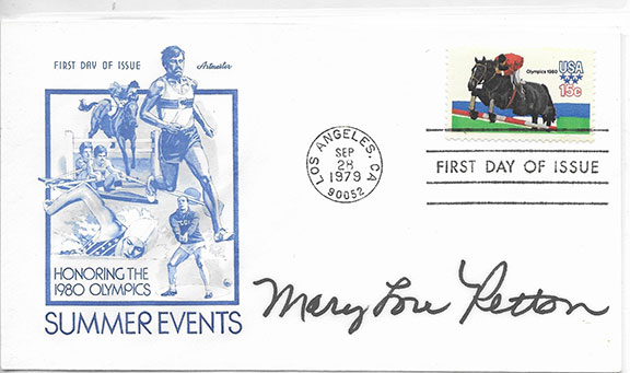 RETTON, Mary Lou (1968- ) American gymnast who won 1 gold, 2 silver and 2 bronze in the 1984 Summer Olympics. FDC honoring the 1980 Olympics. Cachet of 5 athletes and affixed to this cover is a U.S. 15 cent 1980 Olympics postage stamp cancelled First Dat of Issue, Los Angeles, CA, SEP 28,1979. Boldly hand signed by Mary Lou Retton. Cover in very fine condition.....................$25.00![]() |