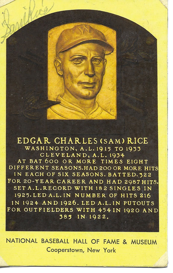 RICE, Edgar C. (1890-1974). American baseball player who had 200 or ore hits in each of six seasons. He set the A.L. record with 182 singles in 1925. Yellow Baseball HOF plaque signed in ink in the upper left-hand corner. In V/G condition...........$150.00 |