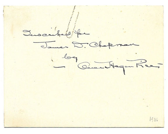 RICE, Alica Hagen (1870-1942). Noted American author, best known for “Mrs. Wiggs of the Cabbage Patch” (1901). Fine bold full signature along with a presentation inscription on a large card. One light paper clip stain not affecting the signature.............$65.00![]() |