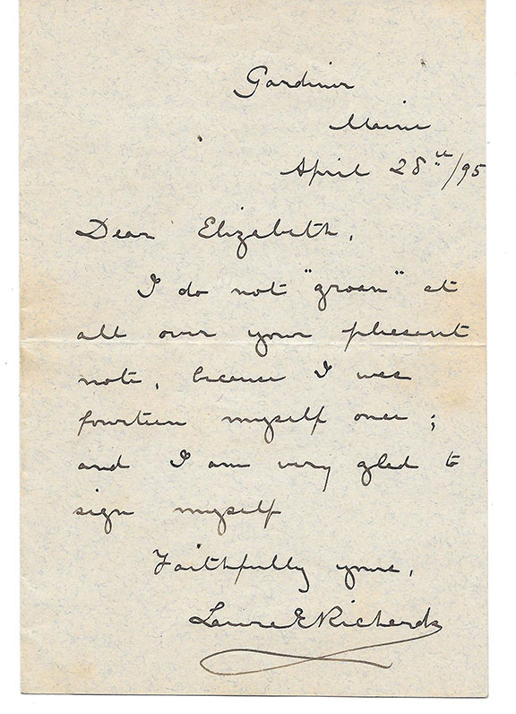 RICHARDS, Laura (1850-1943). American writer of many juvenile stories, daughter of Julia Ward Howe. Best remembered for “Captain January”. Recipient of the Pulitzer Prize (1917). Autograph letter signed, one full page, 4/28/1895, Gardiner, Maine. She writes: “I do not ‘groan” at all over your pleasant note, because I was fourteen myself once: and I am very glad to sign myself Faithfully yours, Laura Richards”. A very fine example of an autograph seldom seen on the marketn.................$85.00