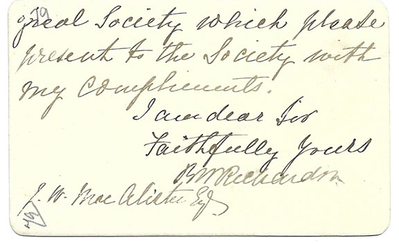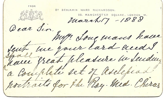 RICHARDSON, Sir Benjamin Ward (1828-1896). Surgeon, sanitary reformer, and prolific writer. He not only continued but extended John Snow’s work on inhalation anesthesia and brought into clinical use no less than fourteen anesthetics, of which methylene bichloride is the best known. He invented the first double-valved mouthpiece for use in the administration of chloroform. He also made known the peculiar properties of amyl nitrite, a drug which was largely used in the treatment of angina pectoris. He introduced the bromides of quinine, iron and strychnia, ozonized ether, styptic and iodized colloid, hydrogen peroxide and sodium ethoxide. All these substances were soon largely used by the medical profession. Uncommon a.l.s. on his name imprinted correspondence card, two pages, Manchester Square, 17 March 1888 measures 3”x4”. To J.W. MacAlister, agreeing to send “a complete set of Asclepiad portraits” for the Surgical Society library. In very good condition.........$185.00