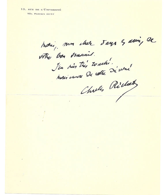 RICHET, Charles (1850-1935) French physiologist at the Collège de France known for his pioneering work in immunology. In 1913, he won the Nobel Prize in Physiology or Medicine "in recognition of his work on anaphylaxis". Richet devoted many years to the study of paranormal and spiritualist phenomena, coining the term "ectoplasm". He also believed in the inferiority of Black people, was a proponent of eugenics and presided over the French Eugenics Society towards the end of his life. The Richet line of professorships of medical science would continue through his son Charles and his grandson Gabriel. Gabriel Richet was one of the great pioneers of European nephrology. Scarce autograph letter signed, one page, in French, not translated. Signed in full. With photograph of Richet and original envelope mailed from Paris, 1925. All three items in fine condition..................$295.00