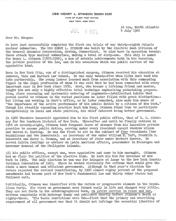 RICKOVER, Hyman George (1900-1986). American military Naval Officer,born of a poor Jewish family in Russia. Worked on the WWII Manhattan Atomic Bomb Project, known as The Father of the Nuclear Navy. He was responsible for the overall design and development of the Nautilus, the world’s first nuclear powered submarine (1954). Promoted to Admiral. Very lengthy typed letter signed, 3 full pages on the imprinted letterhead of U.S.S. Henry L. Stimson. At Sea, N. Atlantic, 4 July 1966 to Mr. Morgan (US Congressman). Admiral Rickover writes in part: “We have just successfully completed the first sea trials of our thirty-eighth Polaris nuclear submarine. The USS Henry L. Stimson was built by the Electric Boat Division of the General Dynamics Corporation, Groton, Connecticut. We also have in operation twenty-three attack type nuclear submarines, making a total of sixty-one.” Rickover in the next two lengthy paragraphs writes about the background of Henry L. Stimson and mentions that Theodore Roosevelt in 1906 appointed Stimson to his first public office that of U.S. Attorney general for the Southern District of New York. In the balance of the letter Rickover continues to describe Stimson’s qualifications and basically writes a complete biography of Henry L. Stimson. Fantastic content on every page and signed in ink at the end “H.G. Rickover.” The letter is in excellent condition..................$950.00