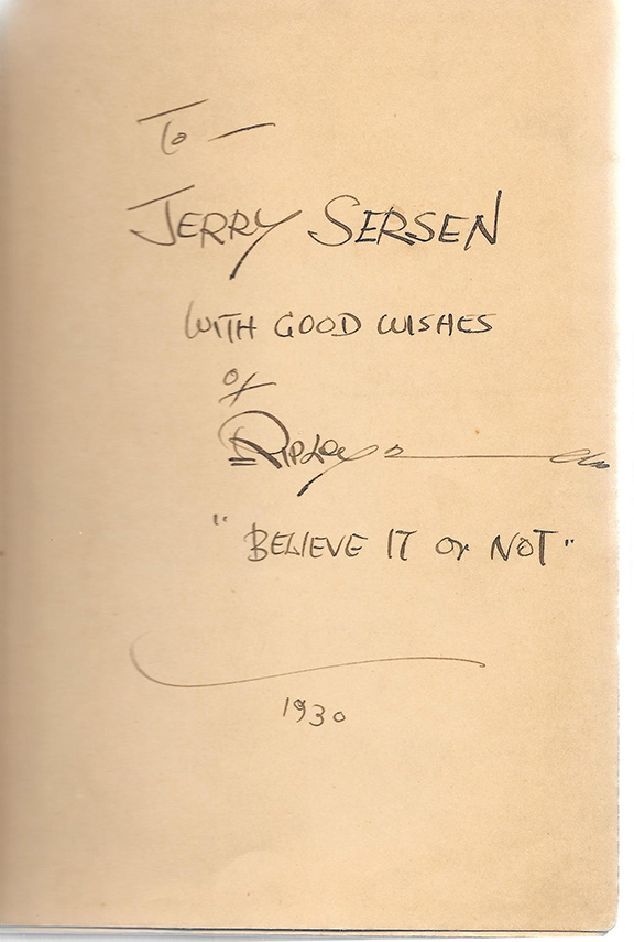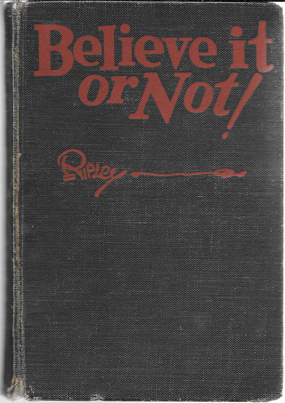 RIPLEY, Robert (1890-1949). American cartoonist, sold his first cartoon to Life Magazine (1908). He played semi-pro baseball (1908). He was the New York State handball champion and he wrote a book on boxing. Created “Ripley’s Believe It Or Not”. His book: “Believe It Or Not”. Simon & Schuster, New York, eighteenth printing, 1930. One hundred seventy-two pages, illustrated. Inscribed, signed and dated on the front free endpaper. “To Jerry Sersen, with good wishes of Ripley, Believe It or Not, 1930”. Some wear to the cover and spine otherwise good ............................SOLD