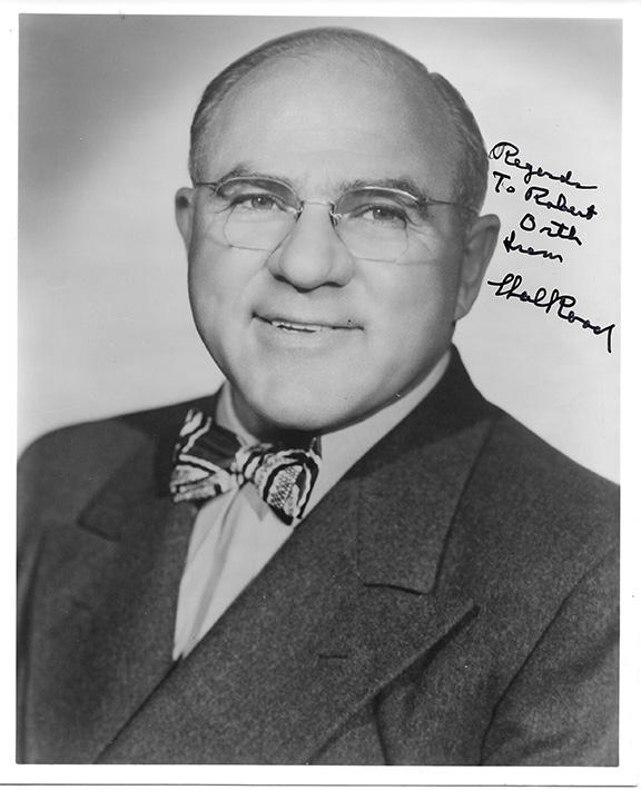 ROACH, Hal (1892-1992). American picture producer, best known for his association with Laurel and Hardy and the “Our Gang” series of films. Photograph, 8”x10”, B&W, head & shoulders pose. Inscribed and signed: “Regards to Robert Orth from Hal Roach”. Date stamp on verso “Dec. 9, 1980”. Fine condition.......$100.00![]() |