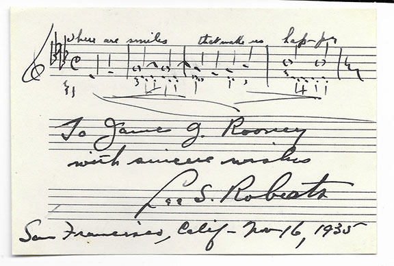 ROBERTS, Le S. (1884-1949) American composer and pianist. Best known composition is “Smiles.” Written in 1917 and is still taught today to elementary school children. He recorded 100’s of music rolls under his name for the Music Roll Company. Autograph musical quote signed (AMuQS). Four bars of music and the words from his famous song “Smiles.” On a 3”x4.5” lined music card. Inscribed, signed, and dated “San Francisco, Calif. Nov.16,1935. A to top he has written: “There are smiles that make us happy.”.......$185.00