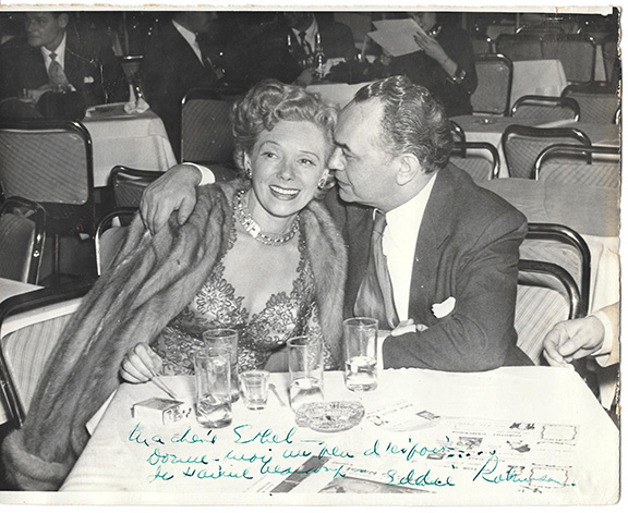 ROBINSON, Edward G. (1893-1973). Romanian born, American actor of Jewish decent. He was a very popular star during Hollywood’s Golden Age. Best remembered for his gangster roles. Honorary Academy Award (1973). Photograph, B&W, 8”x10” one of a kind photo taken in a night club of Robinson about to kiss a woman wearing a fur at their cocktail table. Nice inscription in French most likely to the woman in the photo, signed “Eddie Robinson”. Most unusual, like wrinkles with paper mounting on verso...........................$150.00
