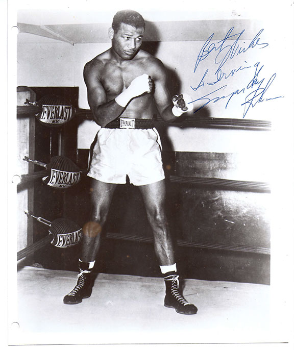 ROBINSON, Sugar Ray (1921-1989). World welterweight and Middleweight Champion. He is regarded as the greatest boxer of all time pound for pound. Fantastic image of Robinson in a boxing pose in the ring. Inscribed: “Best wishes to Irving, Sugar Ray Robinson”. Three file holes in the left white margin barely touching the image else fine................................SOLD![]() |
