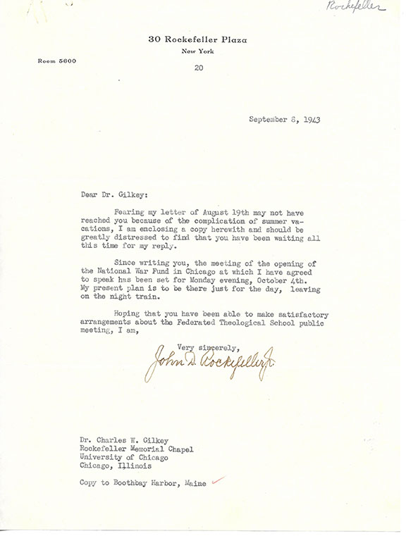 ROCKEFELLER, Jr., John D. (1874-1960). American financier, noted real estate developer. Planned and built Rockefeller Center in New York City. Restored colonial Williamsburg, Va. Typed letter signed, one page, 9/8/1943. Rockefeller writes in part: “the meeting of the opening of the National War Fund in Chicago at which I have agreed to speak has been set for Monday evening, Oct. 4. My present plan is to be there just for the day.” Last name “Rockefeller” written at the very top of the right side of the page otherwise in near fine condition. A scarce signature .............100.00