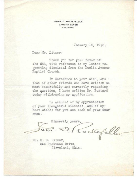 ROCKEFELLER, John D. (1839-1937). American businessman, founder of Standard Oil. Oil industry pioneer capitalist. He virtually monopolized the oil industry until he was forced by the Supreme Court to dissolve the company and break it up into regional producers and refiners. Typed letter signed, one page, on his name imprinted stationery. Ormand Beach, Florida, January 15, 1925. To Mr. H,C, Ditmar. Rockefeller writes in part: “reference to my letter requesting dismissal from the Euclid Avenue Baptist Church. In deference to your wish, and that of other friends who have written me most beautifully and earnestly regarding the question, I have written Dr. Bustard today withdrawing my application….” Very interesting content. In fine condition with a fabulous large signature of Rockefeller........SOLD