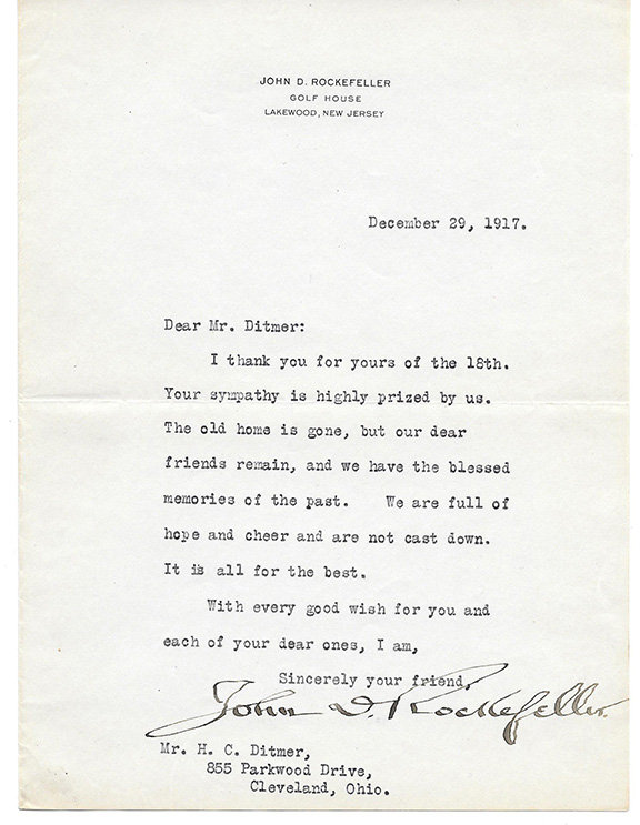 ROCKEFELLER, John D. (1839-1937). American businessman, founder of Standard Oil, oil industry pioneer, capitalist. He virtually monopolized the oil industry until he was forced by the Supreme Court to dissolve the company and break it up into regional producers and refiners. Typed letter signed, one page, on his name imprinted stationery, Golf house, Lakewood, New Jersey, Dec. 29, 1917. To “Dear Mr. Ditmar”. In part: “Your sympathy is highly prized by us. The old home is gone, but our dear friends remain, and we have the blessed memories of the past. We are full of hope and cheer and are not cast down. It is all for the best...” Fine bold signature......... SOLD
