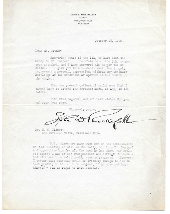 ROCKEFELLER, John D. (1839-1937). American businessman, founder of Standard oil. Oil industry pioneer capitalist. He virtually monopolized the oil industry until he was forced by the Supreme Court to dissolve the company and break it up into regional producers and refiners. Typed letter signed, one full page, on his name imprinted stationery. Kijkuit, Pocantico Hills, New York. October 13, 1920. To Mr. H.C. Ditmar. Rockefeller writes in part: “...we have sent the money to Dr. Bustard...I give you this in confidence, and it only represents a personal expression, without any intimate knowledge of the consensus of opinion of the church on the subject. From the present outlook it would seem that I cannot hope to attend the services much, if any, in the future...There are many wise men in the denomination, in the ministry as well as the laity, who know Dr, Bustard and appreciate him for all the good he has done, who would not expect a man of his independence and strength to have a bed of roses in a relationship such as proposed. However, I assume that somebody would be friendly enough to him to talk plainly to him on this subject, if he does not know himself - but he ought to know himself.” In fine condition with an unusually large, bold signature of Rockefeller........................$1,250.00